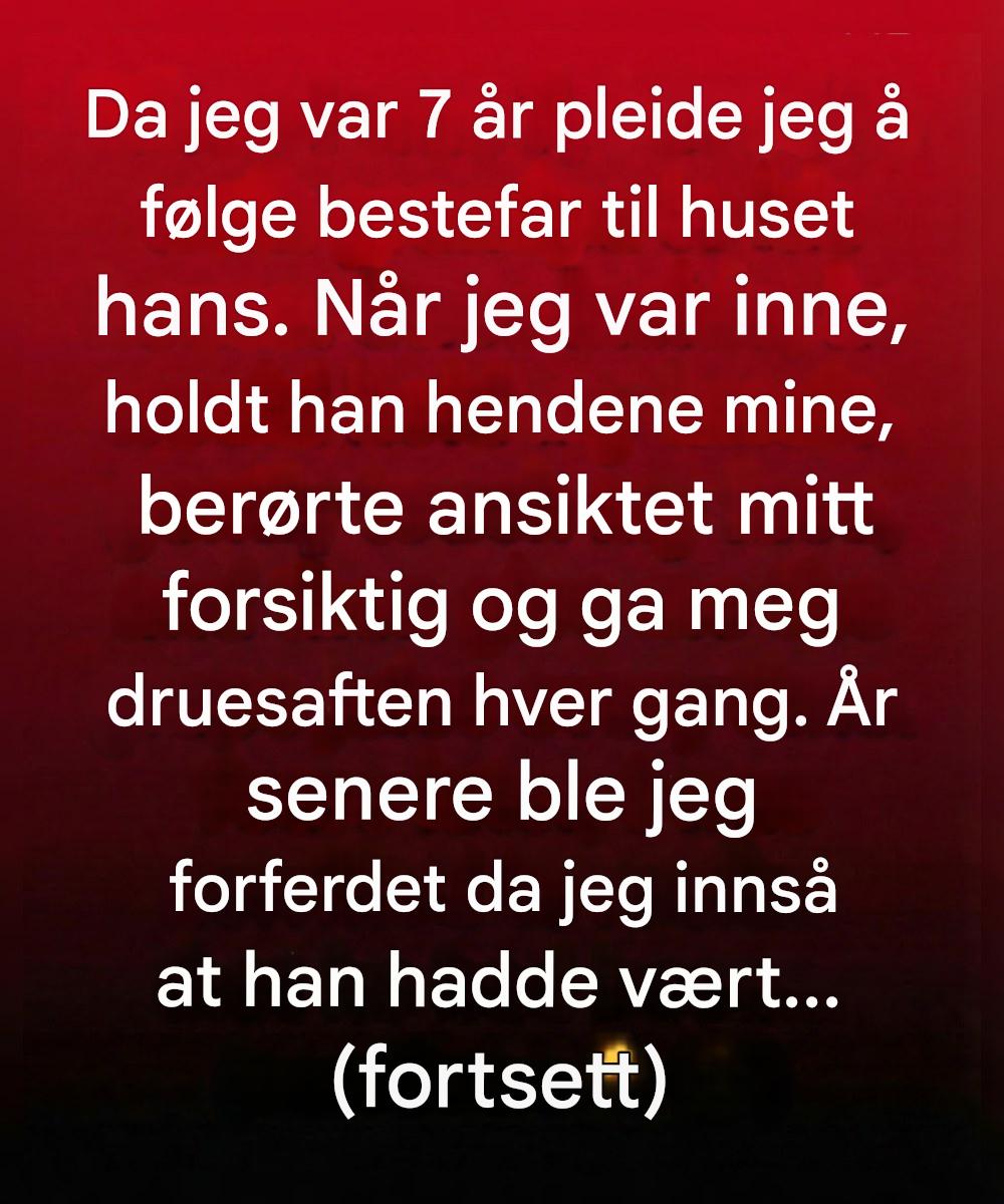 Det føltes viktig, selv om jeg ikke kunne ha forklart hvorfor. Jeg gikk ved siden av ham fra hjørnebutikken til det lille huset hans i den andre enden av kvartalet, med hånden min trygt rundt hans, som om det var jeg som sørget for at vi kom trygt frem. Vel inne utspilte alt seg på samme måte hver gang. Han holdt hendene mine, stirret oppmerksomt på ansiktet mitt og smilte mykt før han helte opp to glass druejuice. Han snakket sjelden, men måten han fokuserte på meg på fikk rommet til å føles rolig og beskyttet. For meg var det ikke noe mer enn vår private vane, en mild pause i en ellers vanlig barndom.