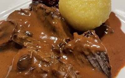 Ingredienser: Sauerbraten: 1 kg hestekjøtt (f.eks. fra låret) 1 løk, i terninger 2 gulrøtter, i terninger 2 laurbærblad 5 pepperkorn…