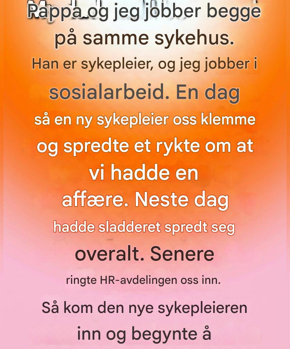 Hun smilte høflig og fortsatte å gå. Jeg tenkte meg ikke om to ganger. Neste morgen hadde imidlertid noe endret seg. Samtalene stoppet da vi kom inn i et rom. Hviskingen fulgte etter oss gjennom korridorene. Et blikk her, en pinlig pause der. På en eller annen måte hadde den harmløse klemmen blitt forvandlet til en historie om et hemmelig, upassende forhold – og den spredte seg med en urovekkende fart.