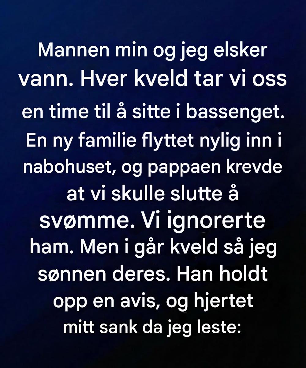 Hver kveld, når dagens støy hadde lagt seg, tilbrakte vi omtrent en time i bassenget i hagen vår, snakket lavt og lot vannets langsomme bevegelse roe tankene våre. Det handlet aldri om trening eller nytelse – det var bare vårt felles ritual, en skånsom måte å gjenopprette kontakten på. Da en ny familie flyttet inn i nabohuset, utvekslet vi vennlige vinker og tenkte ikke mer over det. Ikke lenge etter kom faren bort og ba – høflig, men bestemt – om at vi skulle slutte å bruke bassenget om natten. Han ga liten forklaring, bare sa at det forårsaket vanskeligheter for familien hans. Forvirret, og med en følelse av at rutinen vår var harmløs, bestemte vi oss for å ikke endre noe og fortsatte som vanlig.