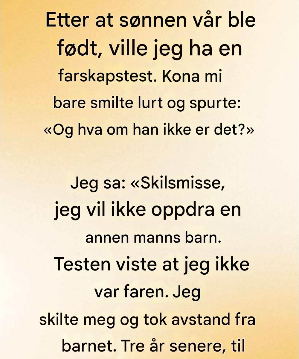 Jeg satt der og stirret på ordene, og følte meg både rettferdiggjort og ødelagt på samme tid. Jeg hadde hatt rett – og det føltes uutholdelig. Alt vi hadde bygget opp kollapset til meningsløshet. Barnet jeg hadde forberedt meg på å elske var ikke mitt. Ekteskapet var en løgn.