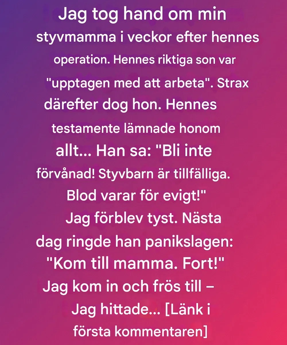 Jeg tilbrakte uker med å ta vare på stemoren min etter operasjonen, mens hennes biologiske sønn hevdet at han var «for opptatt med jobb». Ikke lenge etter døde hun. Da testamentet ble lest opp, gikk alt til ham.