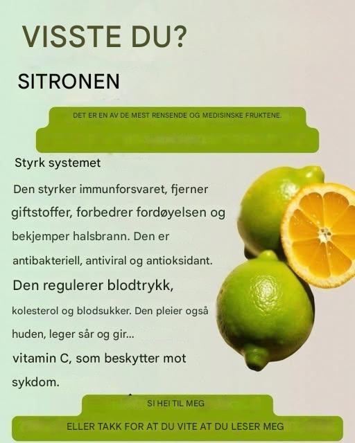 En av sitronens viktigste egenskaper er dens evne til å avgifte kroppen. Takket være det høye innholdet av vitamin C, antioksidanter og naturlige syrer, bidrar sitron til å eliminere giftstoffer, forbedrer leverfunksjonen og fremmer rensing av fordøyelsessystemet. Å tilsette litt sitronsaft i et glass varmt vann hver morgen er et tradisjonelt middel som brukes av mange for å starte dagen med energi, øke stoffskiftet og fremme eliminering av avfallsstoffer fra kroppen.
