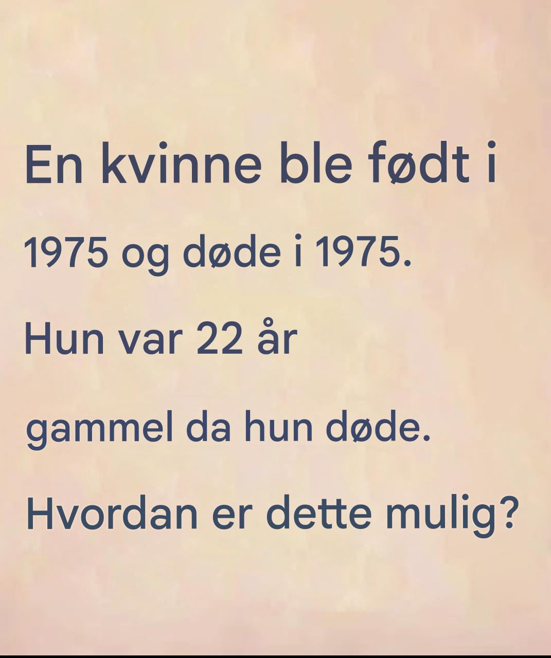 Tenk deg: du snubler over denne merkelige setningen mens du blar gjennom nyhetsfeeden din. «En kvinne ble født i 1975 og døde i 1975. Hun var 22 år gammel.» Den stopper deg. Uforståelig? Forvirrende? Det må være en hake et sted ... Men hvor? Hold deg fast, for denne gåten utfordrer logikken vår, våre automatiske reaksjoner, og krever et snev av fantasi. Hva om nøkkelen var nettopp å ikke tenke slik vi vanligvis gjør?