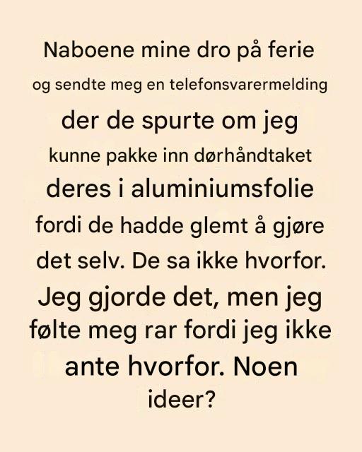 Jeg gikk bort for å gjøre det, i et ønske om å være en hjelpsom nabo, men jeg må innrømme at jeg følte meg litt rar hele tiden. Jeg lurte stadig på: hvorfor skulle noen trenge å pakke inn et dørhåndtak i skinnende aluminium? Det føltes som en scene rett ut av en mysteriefilm – eller et av de virale «livshacksene» på sosiale medier som kanskje fungerer eller ikke fungerer. Nysgjerrig bestemte jeg meg for å grave litt for å finne ut hvorfor folk faktisk gjør dette.