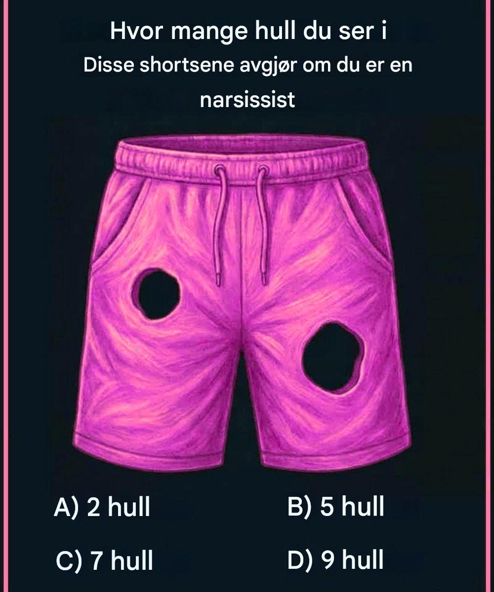 Ved første øyekast virker dette virale bildet som ikke noe mer enn et par skadede shorts. Men i det øyeblikket du leser tittelen – «Hvor mange hull du ser i disse shortsene avgjør om du er en narsissist» – bytter hjernen din umiddelbart fra passiv rulling til analytisk modus. Og det er nettopp derfor denne optiske gåten har tatt over sosiale medier: den utfordrer persepsjonen din samtidig som den erter egoet ditt.