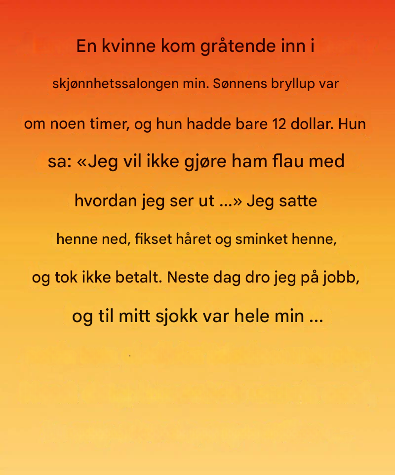 Mens jeg krøllet det sølvfargede håret hennes og forsiktig duppet farge på det slitne ansiktet hennes, snakket hun om sin avdøde ektemann, mannen som alltid hadde minnet henne på hvor vakker hun var. Da jeg endelig snudde henne for å møte speilet, smilte hun – et lite, strålende smil som syntes å lyse opp hele rommet – og hvisket: «Jeg ser ut som mitt gamle jeg igjen.»