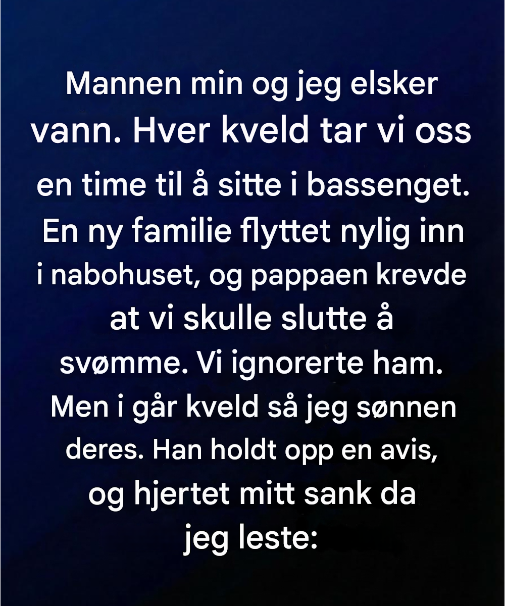 Hver kveld, når verden ble stille og dagen løsnet grepet om oss, gled vi ned i bassenget i hagen vår. Ingen musikk. Ingen plasking. Bare den myke lyden av vann mot flisene og den lave mumlingen av stemmene våre. Det var ikke mosjon eller nytelse – det var vårt ritual. Vår måte å minne hverandre på at vi fortsatt var her, fortsatt forbundet.