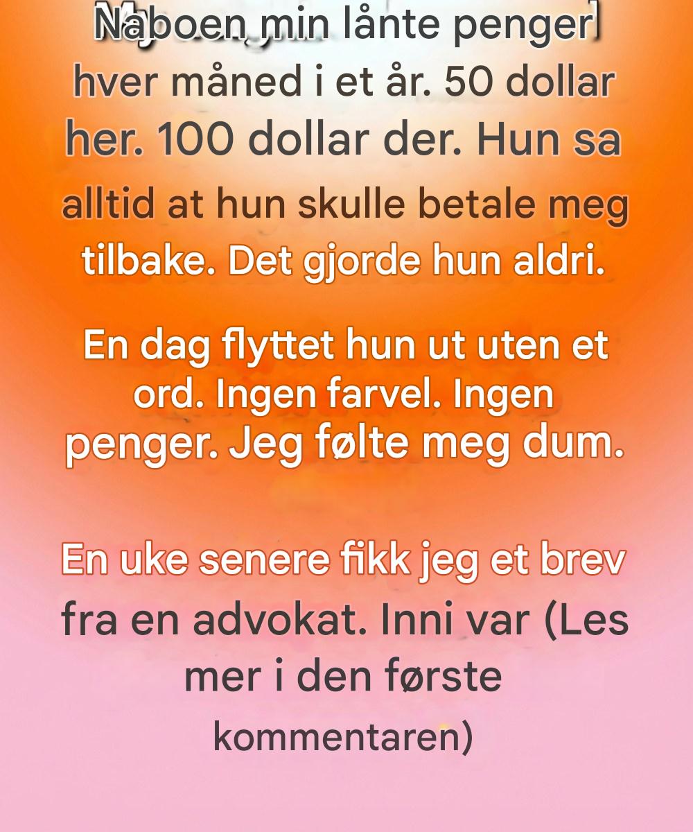 Lena hadde alltid en forklaring – kuttede vaktskift, uventede legebesøk, nødsituasjoner som så ut til å komme etter hverandre. Jeg begynte å føle meg urolig, til og med dum, for at jeg fortsatte å stole på henne. Så en morgen så jeg en flyttebil parkert utenfor leiligheten hennes. Ved slutten av dagen var leiligheten hennes tom. Ingen avskjed, ingen beskjed og ingen tegn til at hun hadde til hensikt å betale det hun skyldte. Mens jeg sto i gangen og stirret på den lukkede døren hennes, følte jeg meg mer flau enn sint. Det var ikke bare pengene som gjorde vondt – det var erkjennelsen av at jeg kanskje ble brukt.