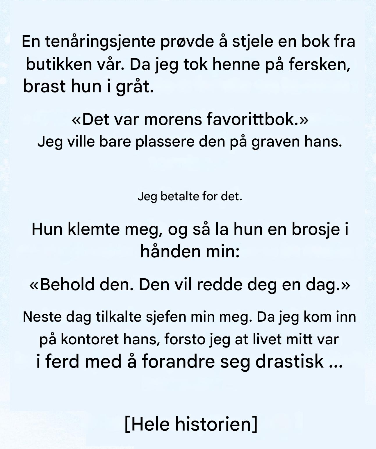 Jeg tok boken, gikk til kassen og betalte for den. Uten et ord, uten å forvente en takk. Øynene hennes lyste opp som om jeg nettopp hadde gitt henne mye mer enn en roman.