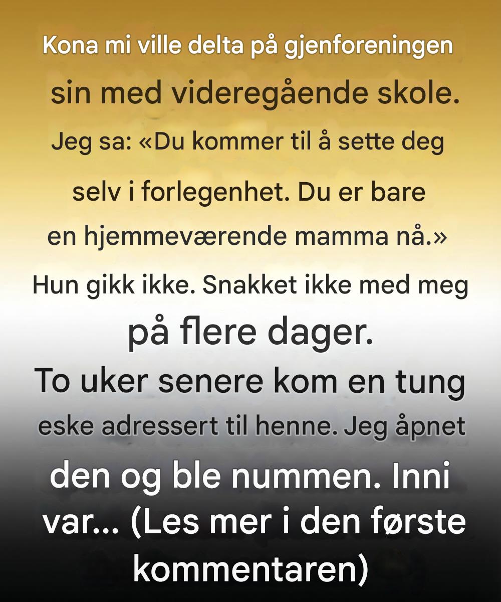 Hun sto i kjøkkendøren, lyset fanget kanten av invitasjonen i hendene hennes. Det var en håpefull mykhet i smilet hennes – et jeg ikke virkelig så før det forsvant. Uten å tenke, uten grusomhet, men fullt av arroganse, snakket jeg.