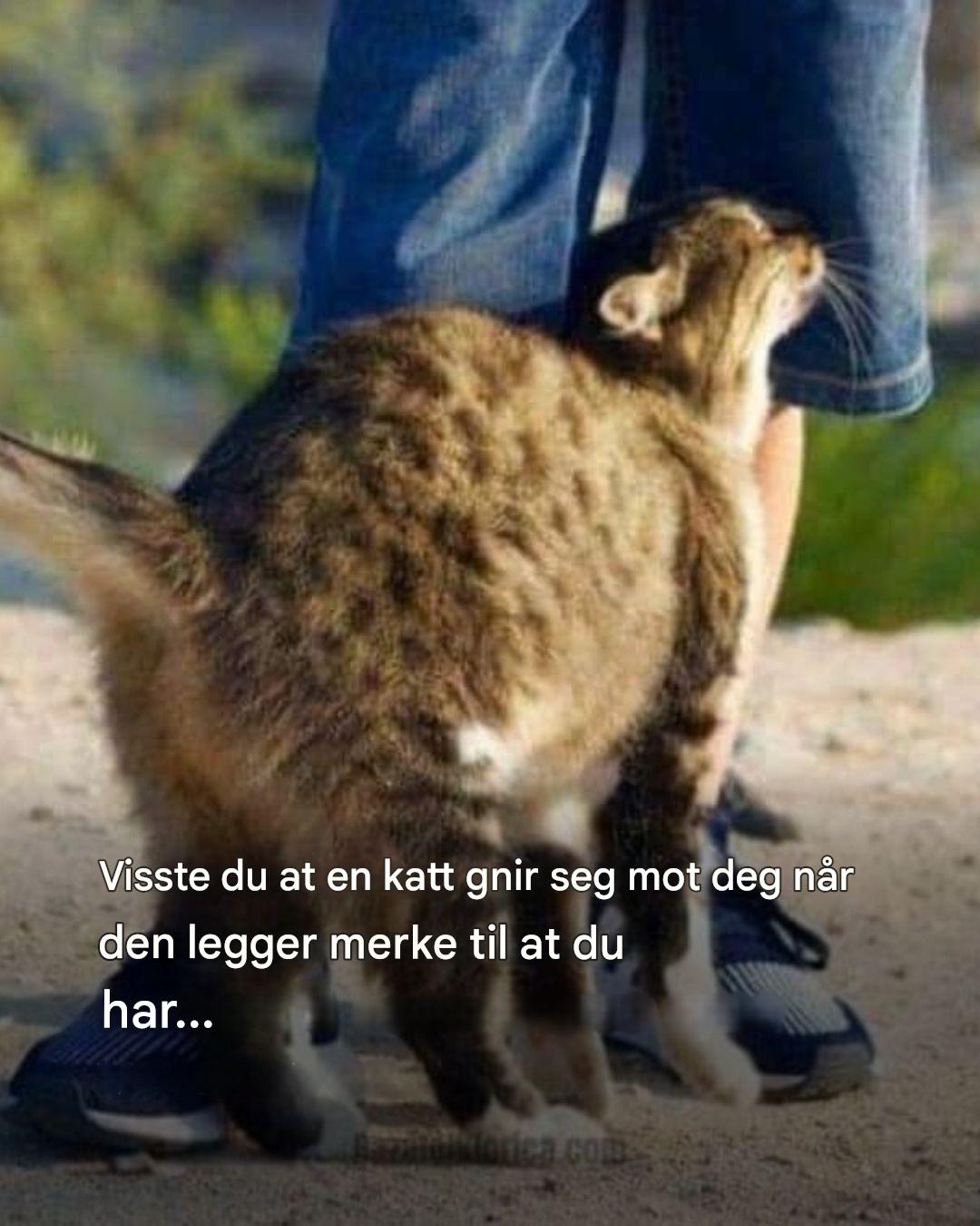 Fordi han liker deg! Denne svært presise gesten er et svært viktig tegn på hengivenhet for en katt. På den annen side, hvis han gnir kinnet mot deg, "markerer" han deg ved å dekke deg med kroppslukten sin, feromoner som skilles ut av små kjertler plassert på haken, leppene og kinnene hans. Denne gesten lar ham ganske enkelt berolige seg selv ved å markere sitt territorium, som du er en del av.