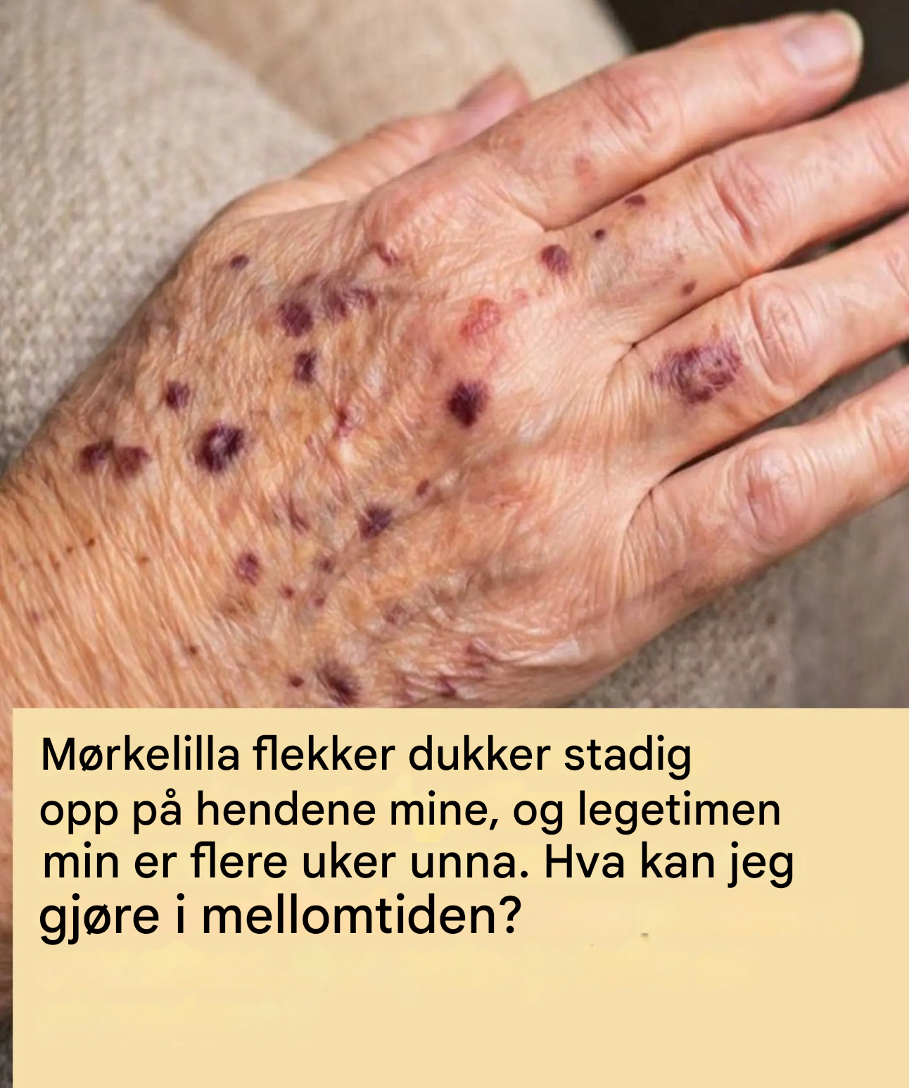 Hos mange mennesker tilsvarer disse flekkene det som kalles aktinisk purpura. Det opptrer hovedsakelig på hender og underarmer, områder som er sterkt utsatt for solen gjennom årene. Huden der blir tynnere og blodårene mer skjøre. Selv om utseendet kan være overraskende, er dette fenomenet vanligvis ufarlig og krever ikke spesifikk behandling, noe som kan være betryggende mens man venter på en legetime .