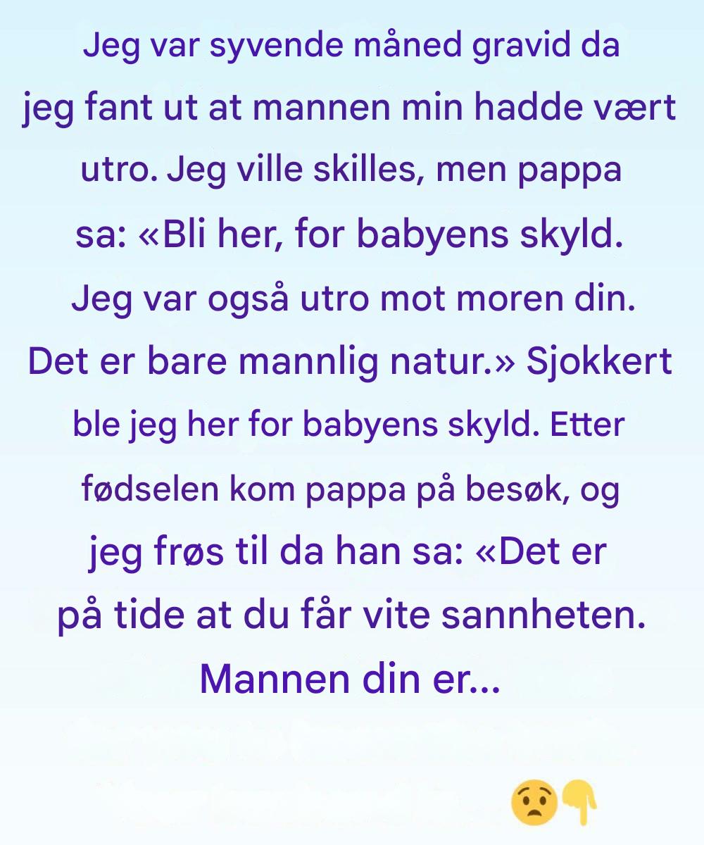 «Jeg var utro mot moren din da hun var gravid», sa han stille. «Det er … mannlig fysiologi. Det betyr ingenting.»