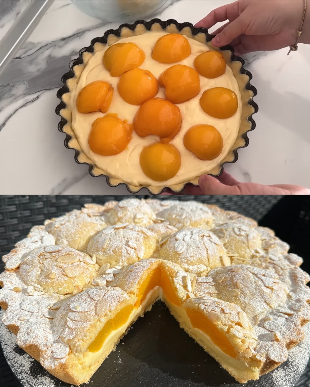Denne fersken- og sitronkrempaien kombinerer en glatt, smøraktig skorpe, kremet sitronkrem og søte fersken i sirup. Toppet med flakede mandler og et dryss melis, er det den perfekte desserten for enhver anledning.