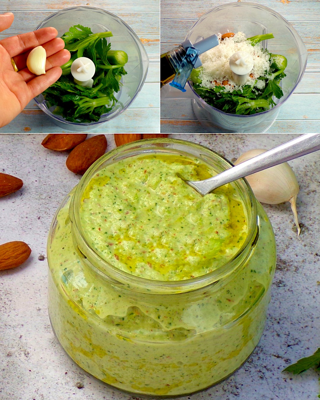 Selleripesto er en lett og kremet saus som kan lages på bare 5 minutter. Laget med selleri (ribbein og blader), mandler, revet parmesanost, hvitløk, extra virgin olivenolje og fersk basilikum, er denne pestoen perfekt til å krydre pasta, risotto eller smøre på kanapeer og bruschetta. Det er en variant av den klassiske liguriske oppskriften, ideell for å bruke opp overflødig selleri.