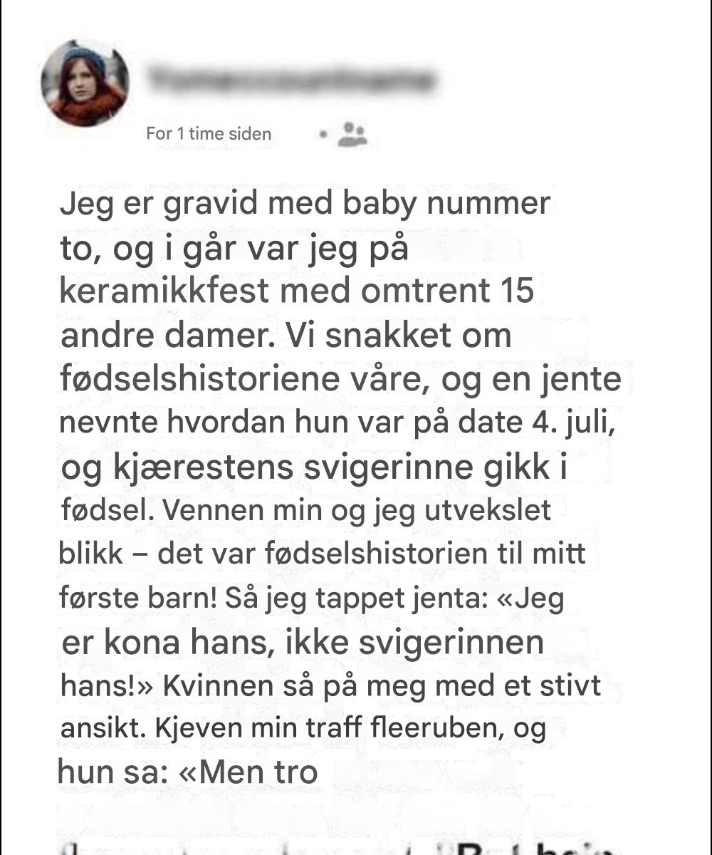 Hendene mine skalv da jeg låste opp telefonen og viste henne bakgrunnsbildet mitt – et bilde av Malcolm, Tess og meg, mens den gravide magen akkurat begynte å vise seg.