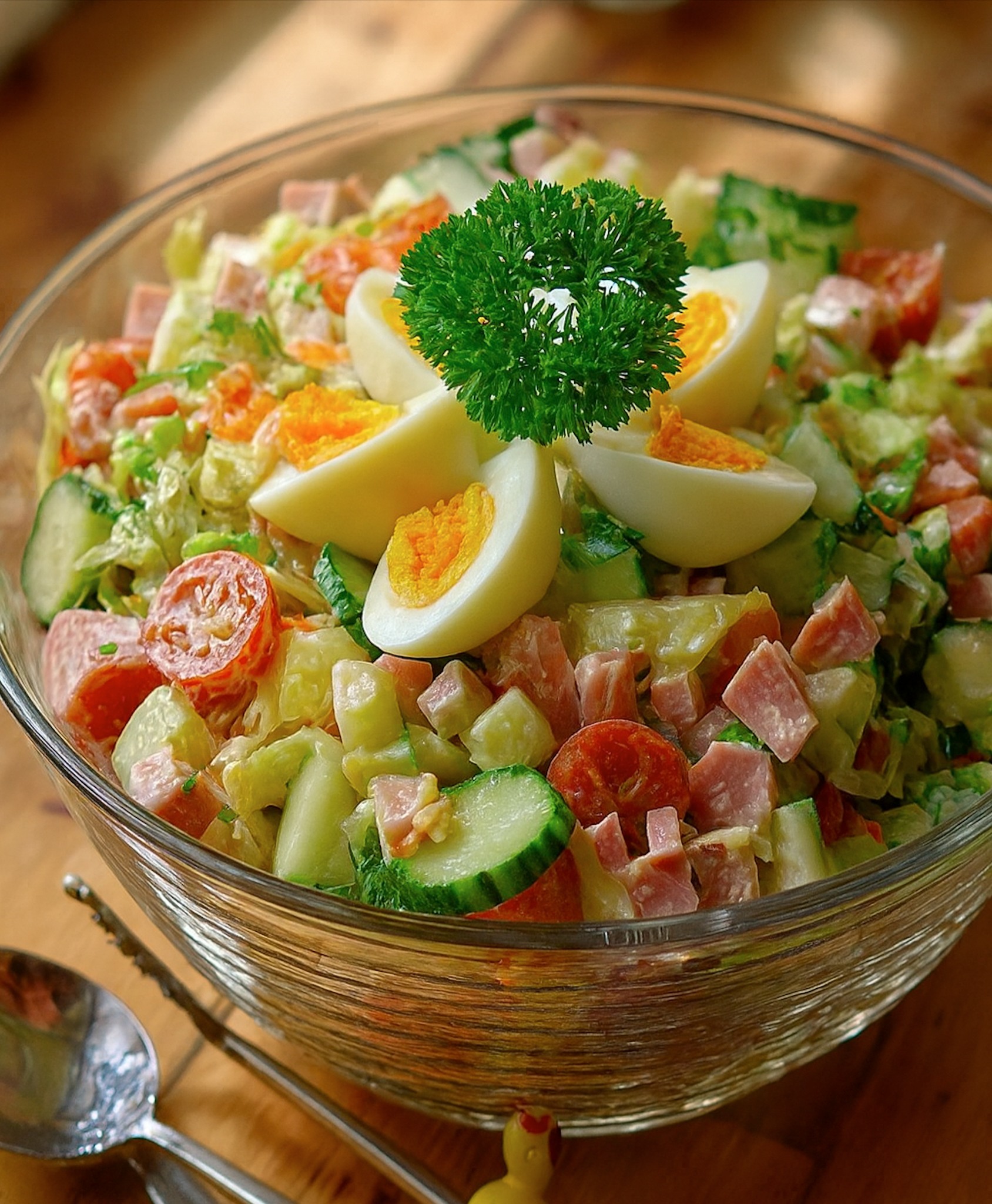 Vask salaten godt, skjær den i biter og legg den i en stor bolle. -