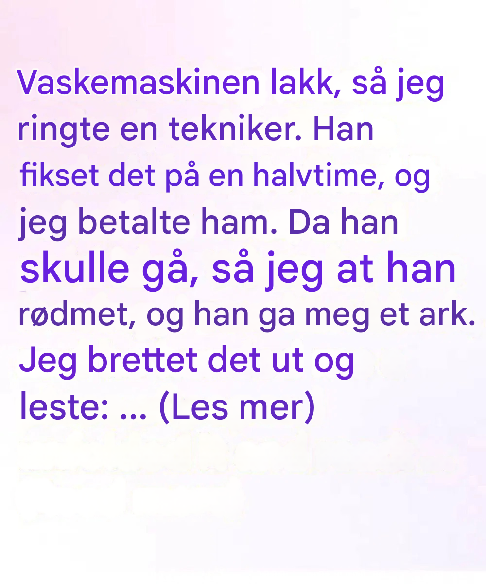 Det begynte med noe så vanlig at jeg knapt tenkte over det: vaskemaskinen min begynte å lekke. Irritert, men pragmatisk, ringte jeg en reparasjonstjeneste. En ung tekniker dukket opp, fikset problemet på kort tid og pakket sammen verktøyene sine. Jeg takket ham, betalte og fulgte ham til døren.