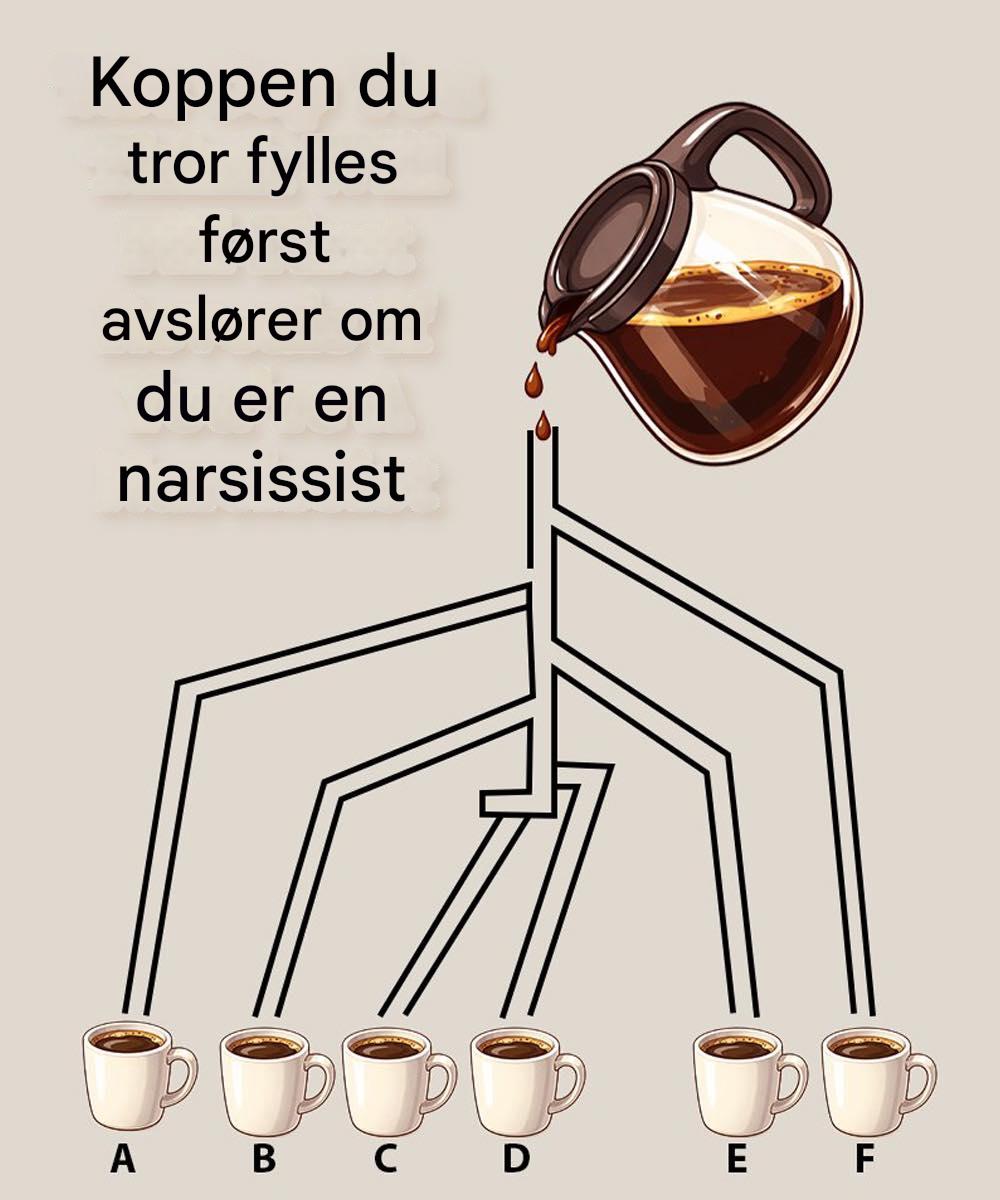 Ved første øyekast ser dette bildet ut som et enkelt logisk puslespill. Kaffe renner gjennom et nettverk av rør mot seks kopper merket A til F. Utfordringen virker enkel: hvilken kopp fylles først?